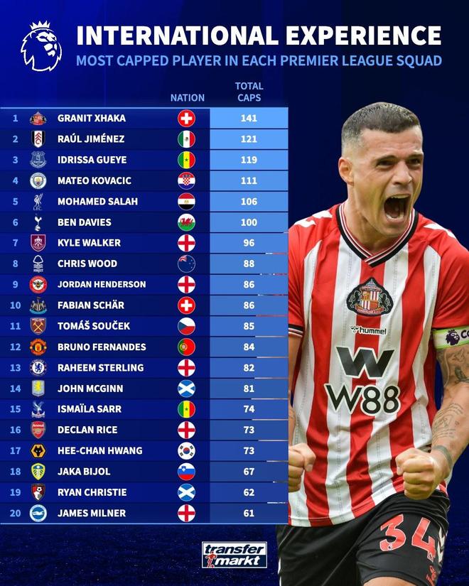 英超俱乐部球员国家队出场数榜:曼城、利物浦前2,切尔西第18